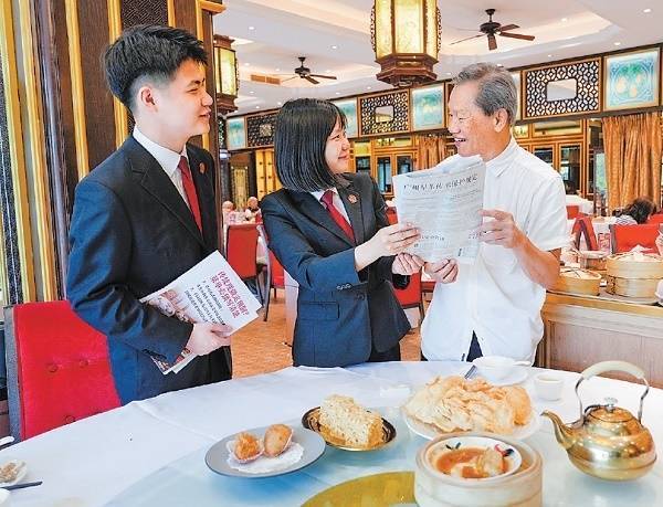 近日,广东省广州市荔湾区人民法院干警走进茶楼,向早茶经营者、消费者进行普法宣传,为广府早茶习俗以及相关制作技艺等非物质文化遗产的传承保护传递“法治滋味”。普法过程中,干警们为经营者、消费者讲解了即将实施的《广州早茶传承保护规定》中关于传统店认证、明码标价、茶位费规范、传统制作工艺等条款,并号召大家共同守护广州早茶文化。